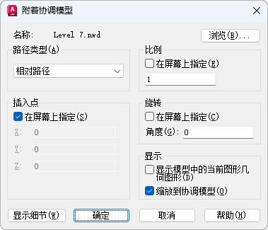 在关闭对话框时,提示您指定协调模型的基点。允许您在命令提示下或使用定点设备输入。如果未选择“在屏幕上指定”,则需输入插入点的 X、Y 和 Z 坐标值。