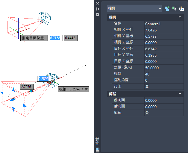 可以修改相机焦距、更改其前向和后向剪裁平面、命名相机以及打开或关闭图形中所有相机的显示。