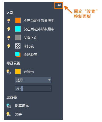 “设置”面板控制图案填充和文字对象的差异、修订云线以及过滤器在外部参照比较结果中的显示方式。针对频繁更改,可以固定“设置”面板,以便于访问。