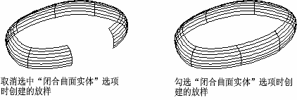 闭合和开放曲面或实体。使用该选项时,横截面应该形成圆环形图案,以便放样曲面或实体可以形成闭合的圆管。(LOFTPARAM 系统变量)