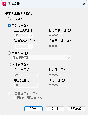 指定在横截面之间绘制平滑实体或曲面,并且在起点横截面和端点横截面处具有鲜明边界。(LOFTNORMALS 系统变量)