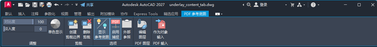 选择 PDF 参考底图时,功能区上将显示 PDF 上下文选项卡。