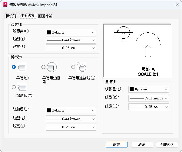 设置局部视图的详图边界线、模型边和连接线的特性。