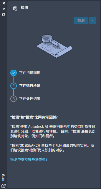 “检测”选项板提供了用于扫描图形和审阅已识别要进行块转换的对象的选项。