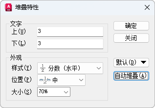 显示“自动堆叠特性”对话框。「自動堆疊」只會堆疊緊接在脫字字元 (^)、正斜線 (/) 或井字號 (#) 之前或之後的數值字元。