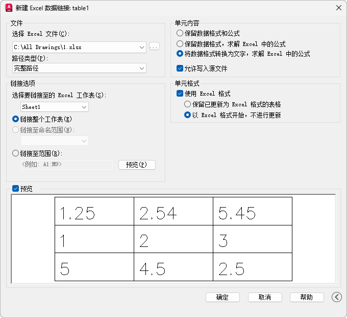 将在原始的 XLS、XLSX 或 CSV 文件中指定的格式输入到图形中,但是使用 DATALINKUPDATE 命令时将不包括对格式所做的任何更改。
