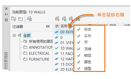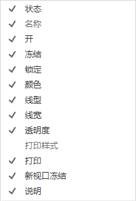 按名称列出所有列。复选标记指示该列包括在显示中。单击列名称可显示或隐藏列。仅当布局视口处于活动状态时,视口冻结、视口颜色、视口线型、视口线宽和视口打印样式才可用。
