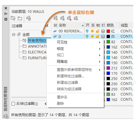删除选定的图层过滤器。无法删除“全部”、“所有使用的图层”或“外部参照”图层过滤器。
