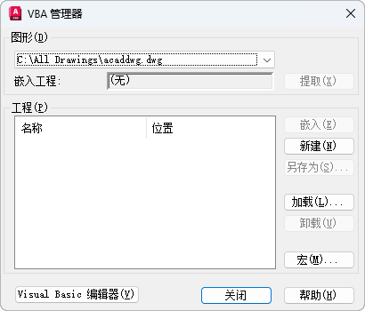 显示“Visual Basic 编辑器”,从中可以编辑工程的代码、窗体和参考,这些工程可以是任何已加载的全局 VBA 工程或任何已打开图形中的嵌入 VBA 工程。也可以从 Visual Basic 编辑器中调试和运行工程。