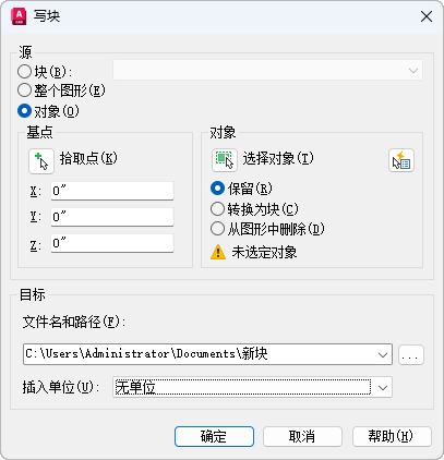 指定文件的新名称和新位置以及插入块时所用的测量单位。