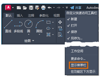 可以从“快速访问”工具栏下拉列表中或通过使用 CUI 来启用菜单栏,以自定义用户界面。