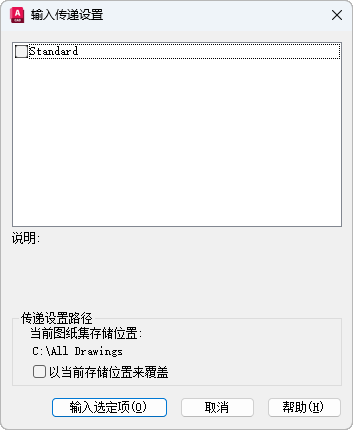 显示传递设置列表。复选要输入到当前图纸集的传递设置。