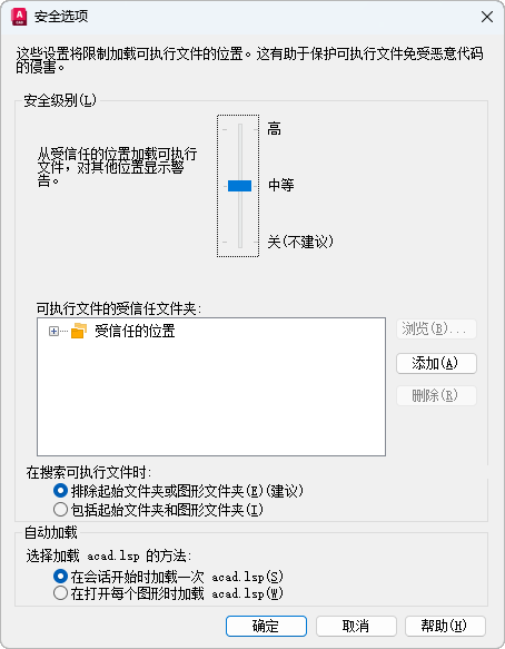 在搜索可执行文件时,控制是包括还是排除“起始”文件夹和当前图形文件夹。起始文件夹由桌面快捷方式图标确定,或者通过双击文件启动程序。(LEGACYCODESEARCH 系统变量)