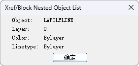 选择该对象将打开“外部参照/块嵌套对象列表”对话框,其中包含的特性信息显示为: