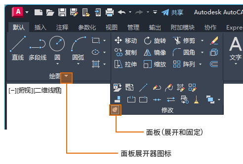 功能区由一系列选项卡组成,这些选项卡被组织到面板,其中包含很多工具栏中可用的工具和控件。