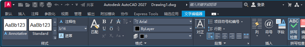 对于在 Windows 操作系统上运行的产品,工作空间是指功能区选项卡和面板、菜单、工具栏和选项板的集合,它可为您提供一个自定义、面向任务的绘图环境。您可以通过更改工作空间,更改到其他功能区。在状态栏中,单击“切换工作空间”,然后选择要使用的工作空间。例如,下面是 AutoCAD 中可用的初始工作空间。