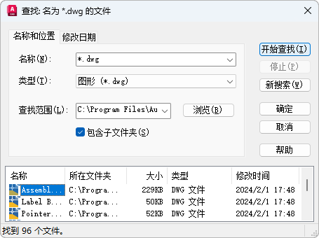 由于要搜索的文件类型由“类型”确定,因此无需在“已命名”中输入文件扩展名。例如,要查找 house102.dwg,请输入 house* 并将“类型”设定为“图形”(*.dwg)。