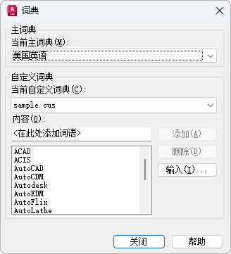 显示当前自定义词典的名称。.cus 扩展用于 AutoCAD 自定义词典。