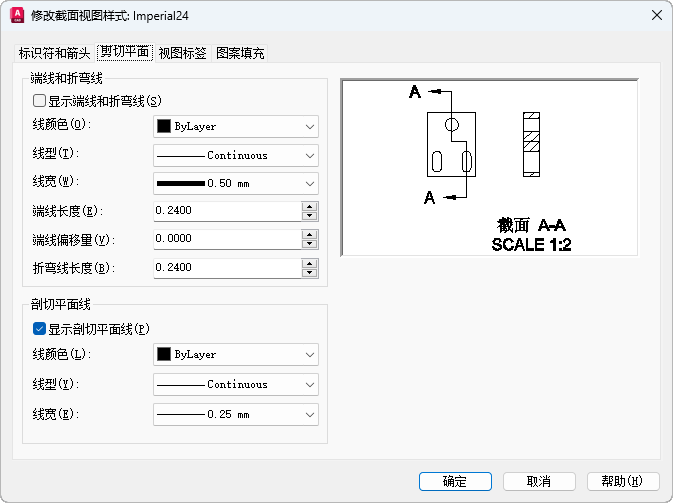 设置剖切线使用的端线、折弯线和平面线段的特性。