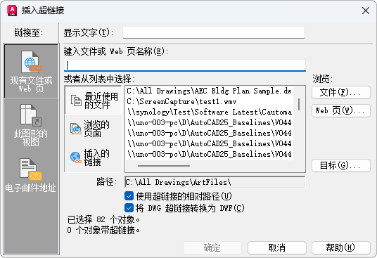 为超链接设定相对路径。如果选择此选项,链接文件的完整路径并不和超链接一起存储。将相对路径设置为 HYPERLINKBASE 系统变量指定的值,如果未指定 HYPERLINKBASE 的值,则将相对路径设置为当前图形路径。如果没有选择此选项,则关联文件的完整路径和超链接一起存储。