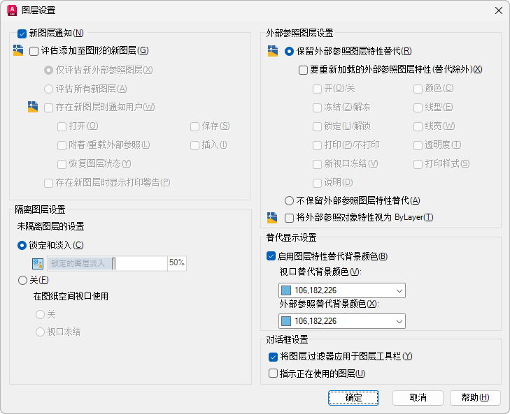 控制发出新图层通知的时间、在隔离某些图层时的图层行为、是否将图层过滤器应用到“图层”工具栏以及图层特性管理器中视口替代的背景色。