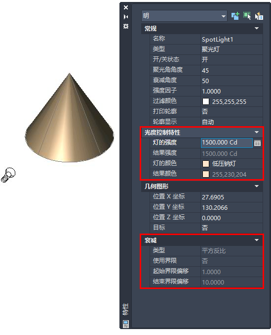 下图是光度控制聚光灯的样例,它具有“特性”选项板上列出的光度控制特性: