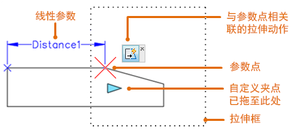 通常,先创建参数,然后再将动作与该参数关联。参数可表示为参数点,并使用一个或多个自定义夹点,此类夹点可在块插入图形并已选定时显示。