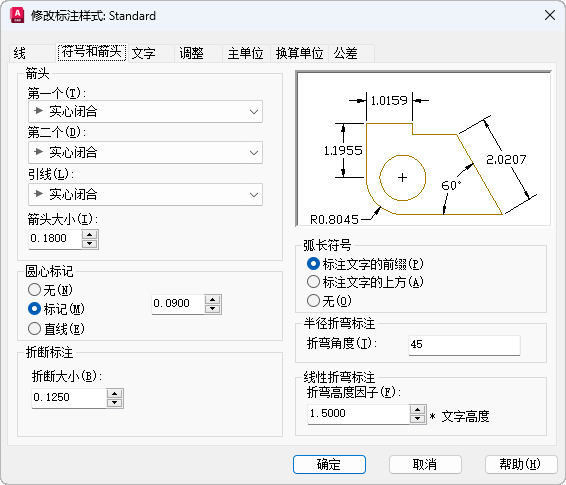 控制弧长标注中圆弧符号的显示。(DIMARCSYM 系统变量)