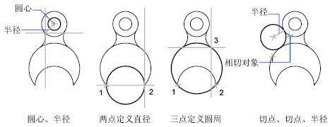 可以使用多种方法创建圆。默认方法是指定圆心和半径。下图还展示了绘制圆的其他三种方法。