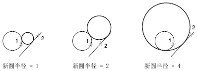 切点是一个对象与另一个对象接触而不相交的点。要创建与其他对象相切的圆,请选定该对象,然后指定圆的半径。在下图中,加粗的圆是正在绘制的圆,点 1 和点 2 用来选择相切的对象。