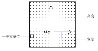 下图是一个 16 x 16 点阵的样例,可用于设计扩展大字体(例如 Kanji 字符)。在此样例中,点之间的距离为一个单位。标注指向正方形单位。