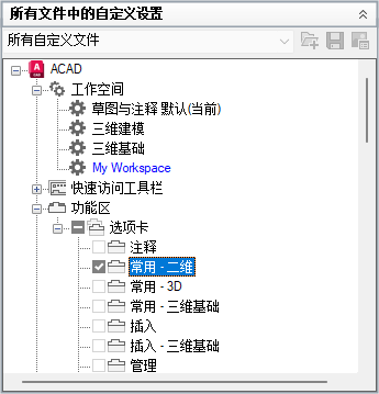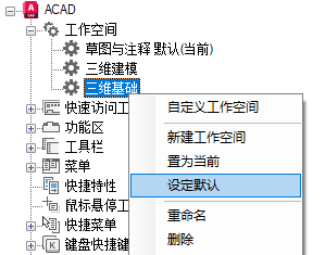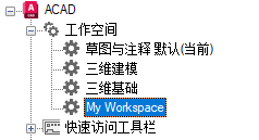 可以将 CUIx 文件中的工作空间标记为默认。将工作空间设置为默认可以确定,在第一次将 CUIx 文件加载到程序中后,或在使用 CUILOAD 命令加载 CUIx 文件之后,应该恢复此工作空间。