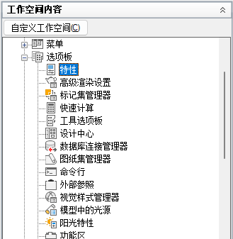 在“工作空间内容”窗格中,单击“选项板”旁边的加号 (+) 以将其展开。