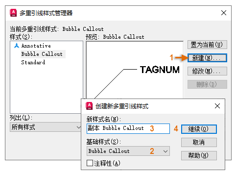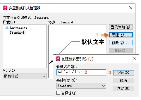 - 在“多重引线样式管理器”中,单击“新建”(1),键入“Bubble Callout”作为新的样式名称 (2),然后单击“继续”(3)。