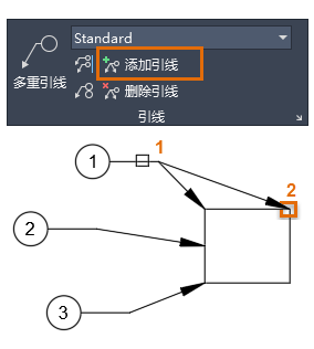 - 单击“添加引线”工具,然后选择顶部多重引线 (1)。在矩形上指定另一个点 (2)。