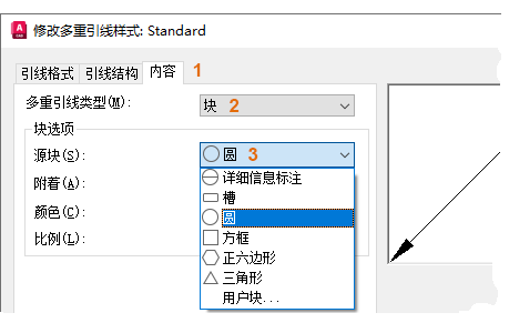 - 接下来,单击“内容”选项卡 (1),将多重引线类型从“多行文字”更改为“块”(2)。对于源块,请选择“圆形”(3)。然后单击“确定”。