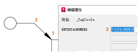 - 使用“端点”对象捕捉,单击矩形的角点以指定箭头位置 (1)。接着单击引线基线的某个位置 (2),在“编辑属性”对话框中键入字母或数字 (3),然后单击“确定”。