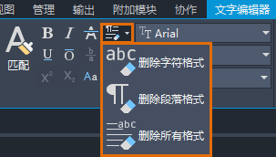 - 在“文字编辑器”功能区上下文选项卡的“格式”面板上,单击“清除”,然后从可用选项中选择: