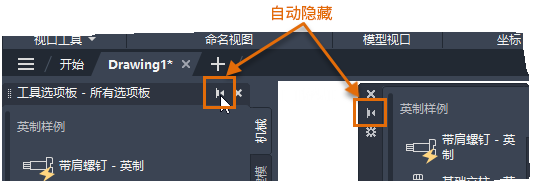 “工具选项板”窗口现在应显示在 AutoCAD UI 中。