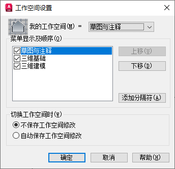 工作空间用于存储 AutoCAD UI 的当前状态。