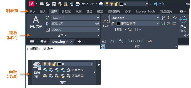 功能区选项卡上的面板可以设置为在应用程序窗口中浮动。当功能区面板处于浮动状态时,无论哪个功能区选项卡处于活动状态,它都可见。当您可能经常在几种不同类型的工具之间切换时,这非常有用。例如,您可能希望浮动“层”或“特性”面板,以便即使“插入”或“注释”选项卡是当前选项卡,它们也可见。