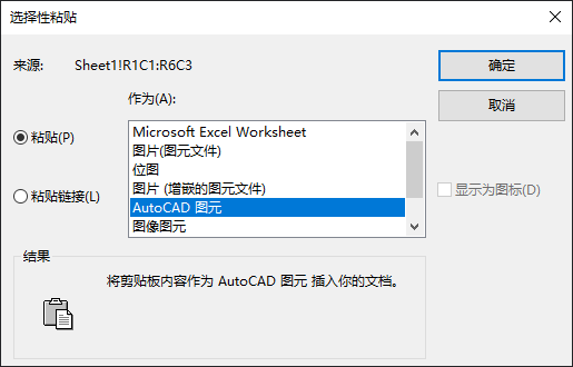 有多个选项可用于将信息粘贴到 AutoCAD 中。这些选项会因源应用程序而异。可能需要进行一些测试,来了解哪个选项最适合您。