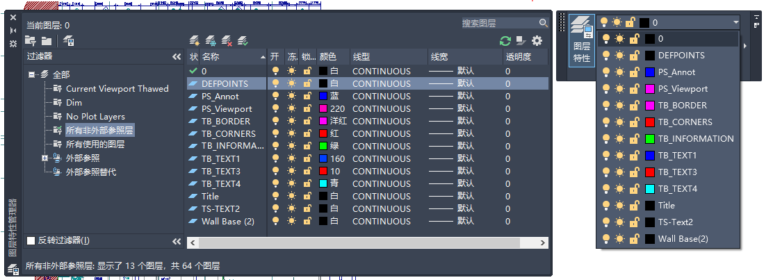 - 动态图层过滤器称为特性图层过滤器。这是两种图层过滤器类型中最常用的,并且它基于特性值。例如,可以创建一个特性图层过滤器,仅显示打开和解冻的图层。