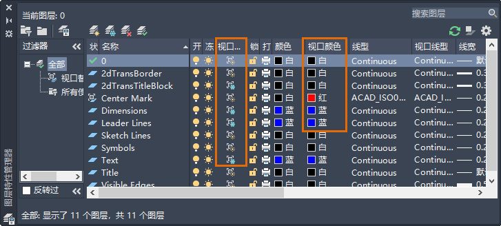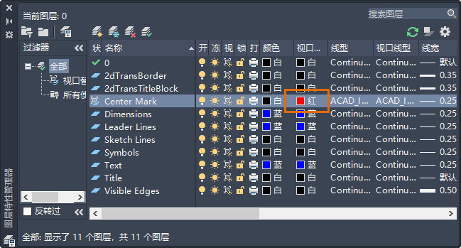 - 将“中心标记”图层的颜色更改为红色。要确保颜色更改仅用于此视口,请在“视口颜色”列中选择颜色。