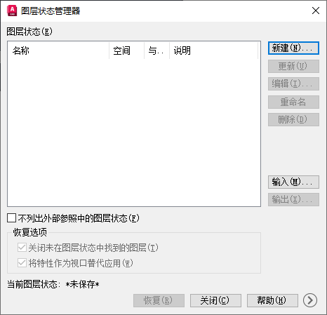 处理复杂图形时,有时可能想要关闭某些图层、冻结某些图层以及更改其他图层的图层特性。如果曾想要返回到此图层集及其特性,则使用图层状态较为方便。图层状态类似现有图层和创建图层状态时图层设置的快照。图层状态会保存到图形中,并且可以随时恢复。还可以输出图层状态,并将其输入到其他图形中。图层状态的其他用途包括:
