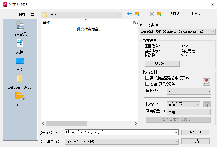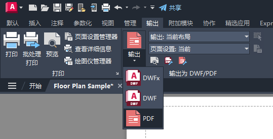 首次使用“快速输出”功能时,可能需要选择输出格式:PDF、DWF 或 DWFx。在选择格式后,可以直接单击“输出”按钮。