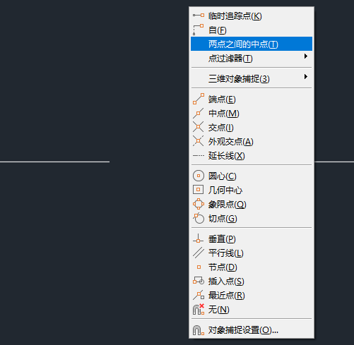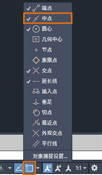在本练习中,我们将使用“中点”对象捕捉选项。因此,我们会确保“中点”对象捕捉处于启用状态。