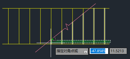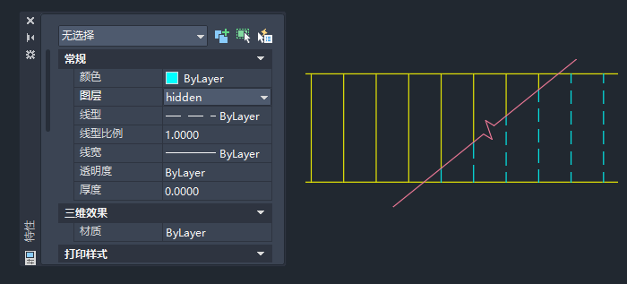 4. 使用交叉窗口,选择打断线右侧的六条直线,然后将图层更改为“隐藏”