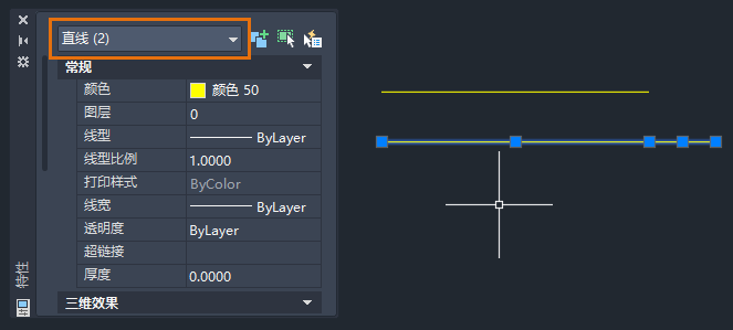 您会看到“直线(2)”显示在“特性”选项板顶部的“对象类型”下拉列表中。