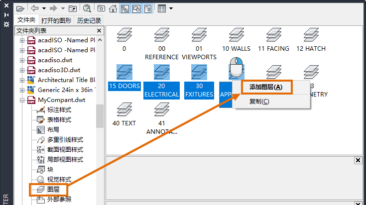 现在,样板中的所有样式和图层都可以在当前图形中使用。名称相同的现有样式和图层不会更改。